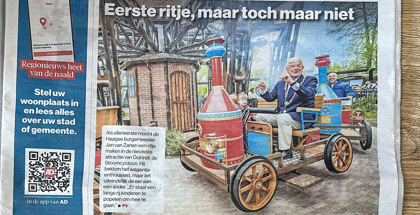 Een flinke blunder, want in Duinrell opende afgelopen weekend helemaal niets. Van Zanen bevond zich dan ook ruim 10 kilometer verderop, voor de openingsceremonie van de StoomCycloon in Drievliet. Kennelijk ziet een AD-verslaggever het verschil niet - en worden dergelijke teksten ook niet nagelezen voordat de krant naar de drukker gaat.