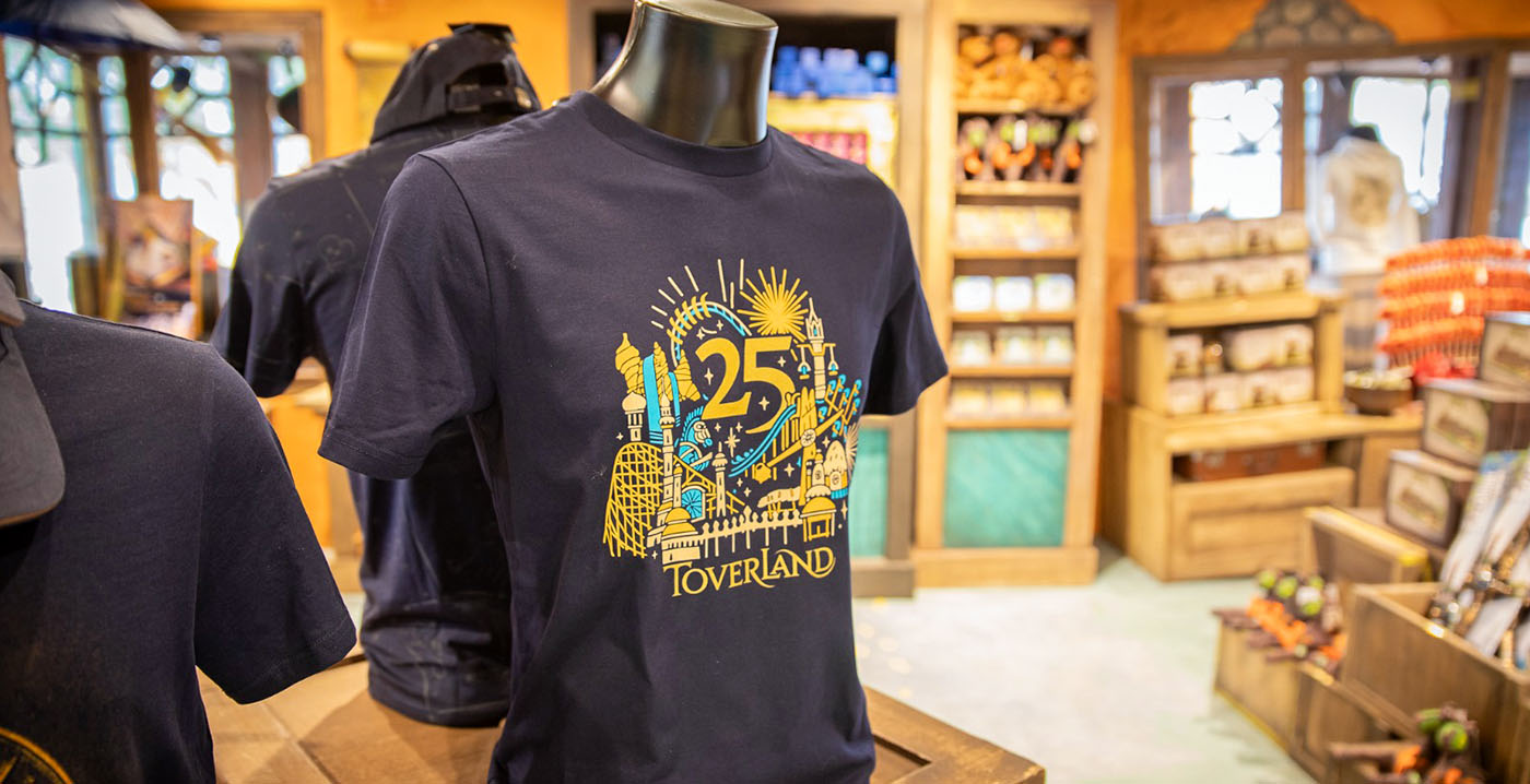 FOTO'S Bezoekers van Toverland kunnen dit jaar speciale jubileumsouvenirs aanschaffen ter ere van het 25-jarig bestaan van het Limburgse attractiepark. In de winkels verschijnen onder meer kleding, mokken en accessoires met een speciaal jubileumontwerp.