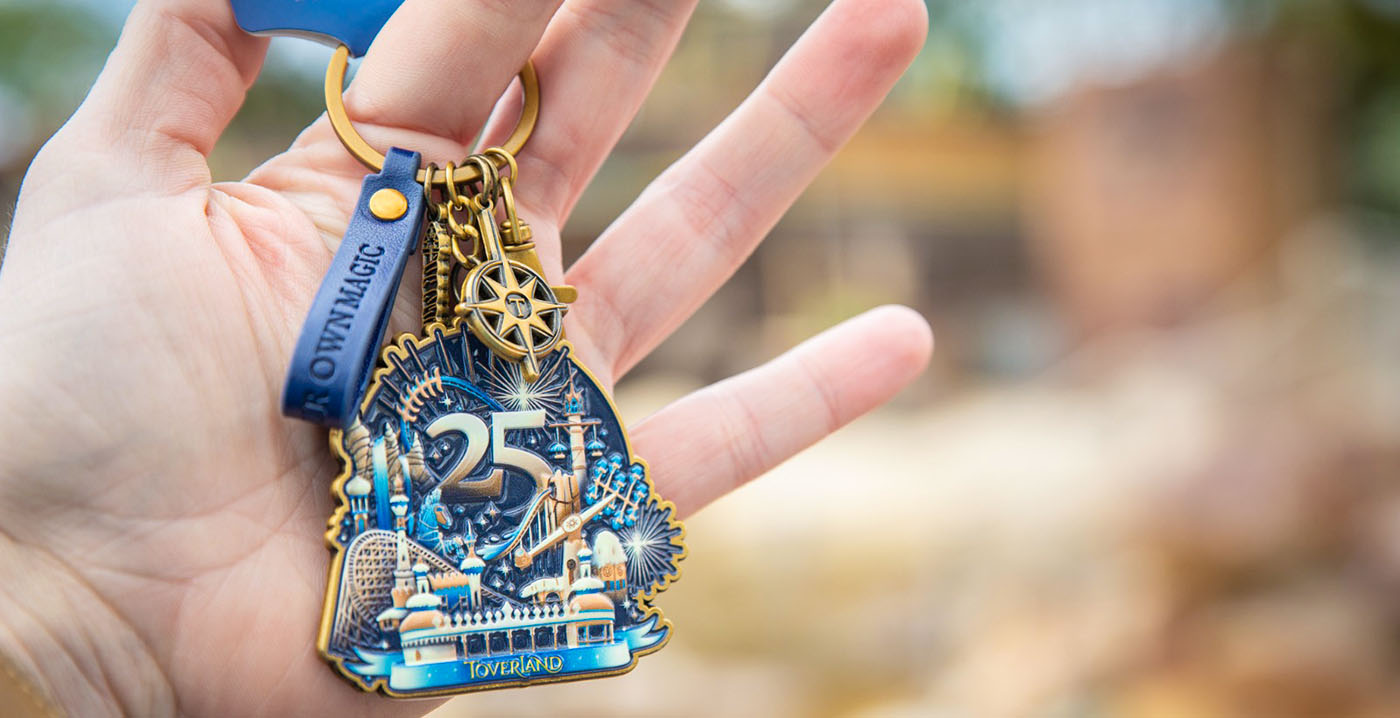 "25 Jaar Magie", valt te lezen op de verpakking van de sleutelhanger. "Nog lang niet uitgetoverd." De pin van 8 bij 7 centimeter wordt verkocht in een luxe doosje. Ook brengt het park twee mokken uit: een espressomok voor 9,95 euro en een zogenoemde stapelmok voor 15,95 euro.