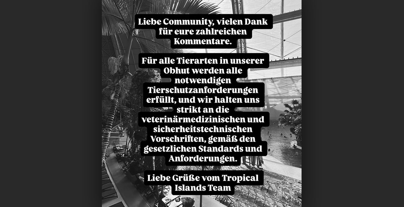 Tropical Islands kreeg plotseling zo veel commentaar op social media dat besloten werd om de reageermogelijkheid onder de meest recente Facebook- en Instagram-berichten volledig uit te schakelen. Onder oudere publicaties, die niets met dieren te maken hebben, wordt nog steeds kritiek achtergelaten. De conclusie: de dieren in het waterpark krijgen het zwaar te verduren.