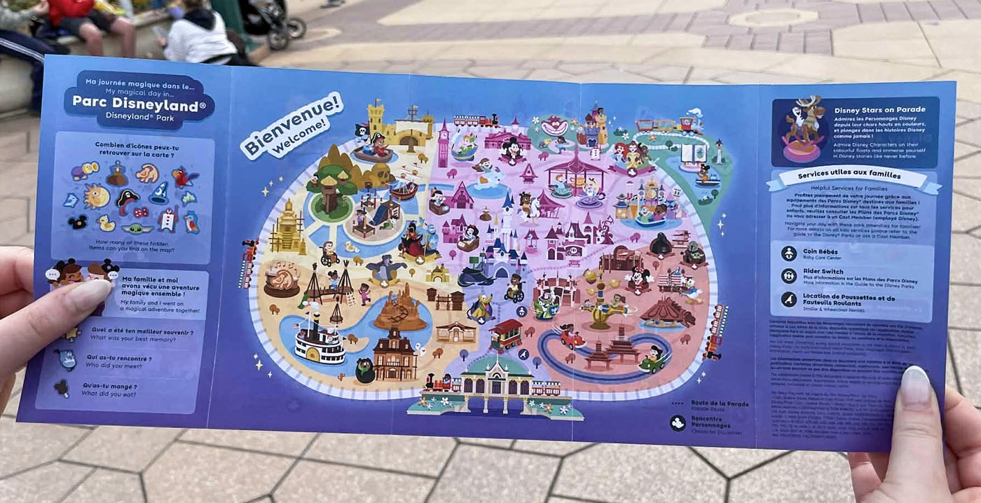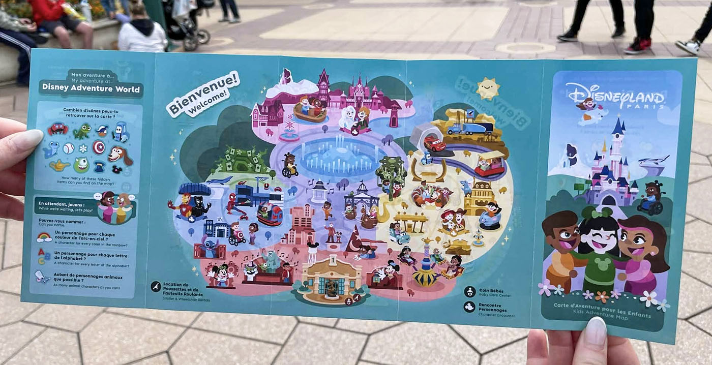 De kinderplattegrond is gratis verkrijgbaar bij de ingangen van de twee parken. In het Disneyland Park ligt de kaart bij City Hall, in Disney Adventure World bij Studio Services.