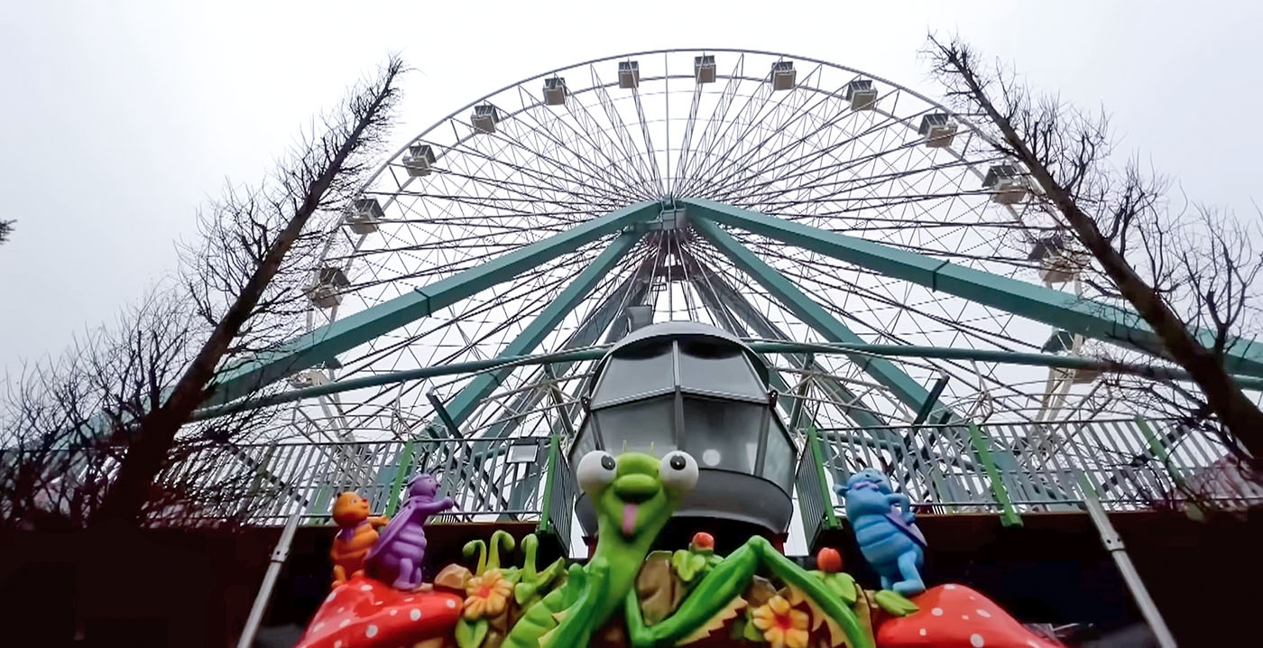 Aan beide zijden van de liftheuvel komt zo'n kolossaal decorstuk te hangen. De wielen gaan draaien zodra een trein omhoog wordt getakeld. Als passagiers boven zijn aanbeland, hangen ze even stil. Vervolgens lijkt het alsof er een kabel knapt, waarna de inzittenden bijna veertig meter naar beneden duiken.